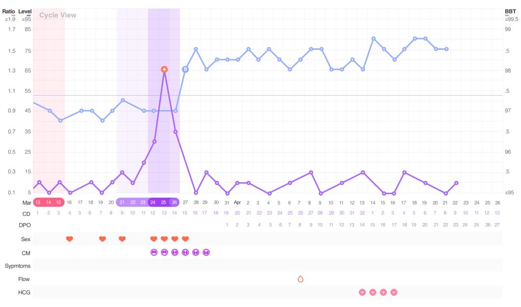 Through all of your diligent tracking and Premom’s smart technology, you can see your fertile window as evidenced by the purple area. It’s important to have intercourse within this timeline as it’s the only time you can get pregnant during your cycle.