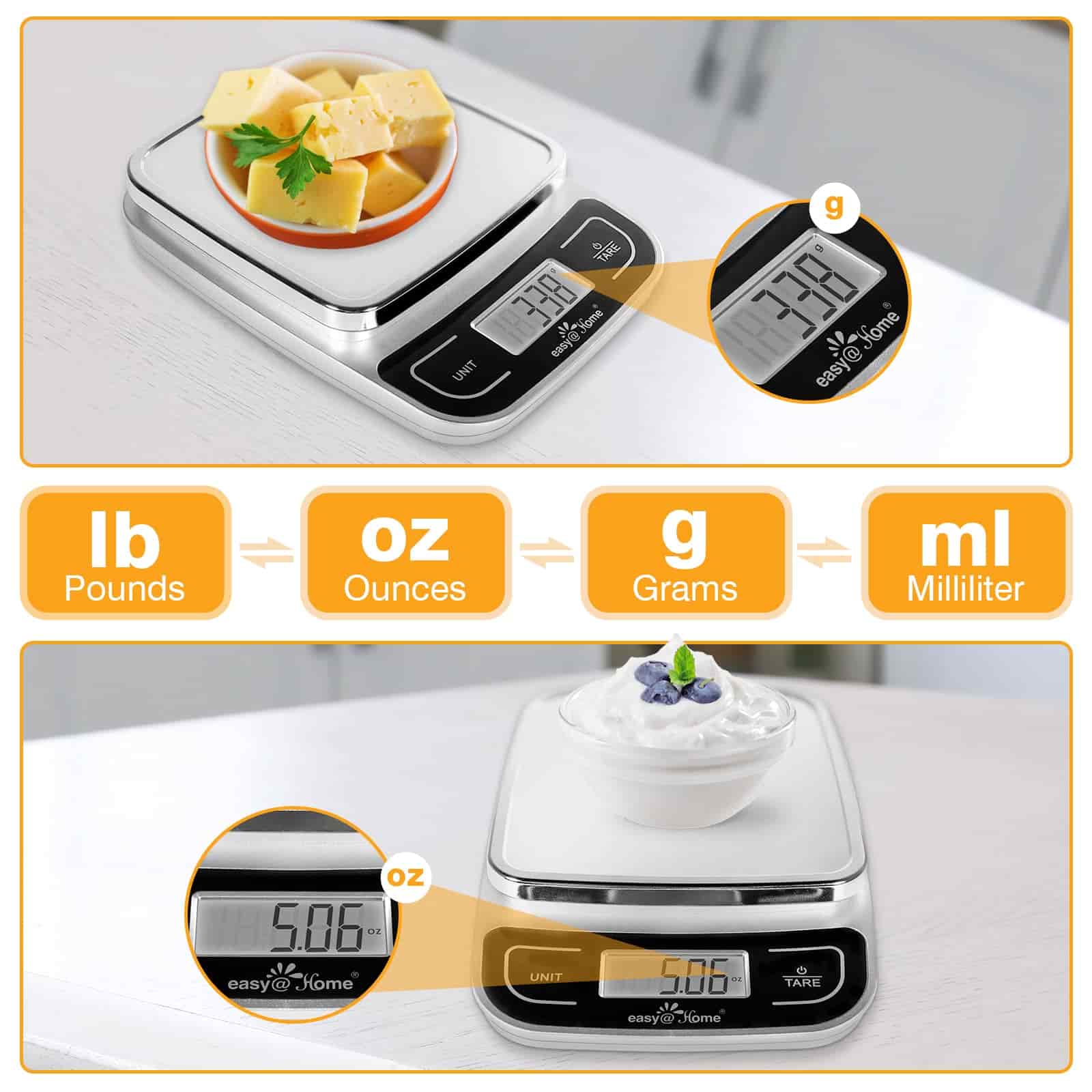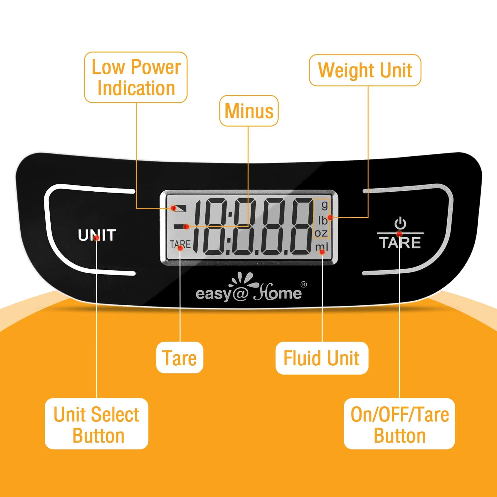 Easy@Home Digital Kitchen Scale provides results in accuracy 0.04 oz. Present accurate results to help you achieve your diet and weight goals. It is one of the lightest kitchen scales on the market and offers easy portability. It boasts an elegant stainless steel surface that is Easy-to-clean. It also features LCD display that you read it clear, and an automatic Tare button that quickly calculates the net weight of your ingredients by subtracting the container weight, whether the container is a bowl, tray or plate.